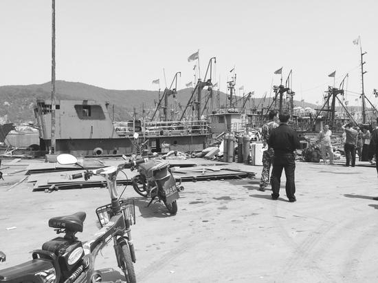 昨日12时40分许,记者赶到事发现场,由于刚刚发生了意外,现场聚集了很多围观者。记者看到两艘渔船并排停靠在码头泊位,岸边的地上摆放着正在进行切割的钢板。据了解,这两艘船正利用休渔期进行整修,有工人正在焊接舵楼、清理油舱等工作。