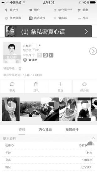 女网友名叫小萍(化名)今年32岁,平时在沈阳做生意,由于生意太忙平时生活交际又十分狭窄,根本没有时间接触男士,于是她尝试选择在佳缘网相亲。在很长一段时间没有觅到中意人后,今年7月她终于认识了一位“高富帅”,这位男士资料里显示年龄为“34岁”,月薪为“2万元以上”,家在“沈阳”。