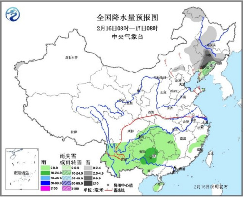 16日08时至17日08时,内蒙古东部、东北地区大部、华北北部等地有小到中雪或雨夹雪,其中辽宁东部、吉林南部有大雪,局地暴雪(10~15mm);山东半岛、西南地区东部和南部、华南西部、江南西部等地有小到中雨。内蒙古中部、华北北部、辽东半岛、山东半岛等地有5~6级风。