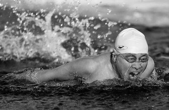 一个10米长、3米宽的“冰窟窿”出现在北陵公园情人岛的冰面上,原来这是沈阳冬泳爱好者开拓出的冬泳“泳道”。在刺骨的寒风中,200余名身着泳衣的冬泳爱好者腾空“飞”起,一跃入水,他们仿佛化身成一尾尾锦鲤四散游去……