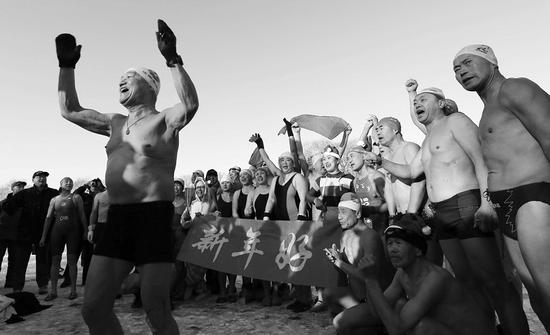 1月1日,是元旦,也是全国冬泳日,在这个特殊的双节里,沈阳市冬泳运动协会的200多名冬泳爱好者齐聚北陵公园情人岛冰面,这些冬泳人用歌舞、跳水等方式庆祝新年和冬泳人自己的节日。