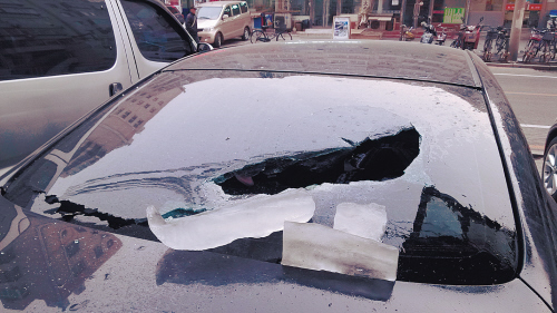 祸从天降 大冰溜砸碎车玻璃