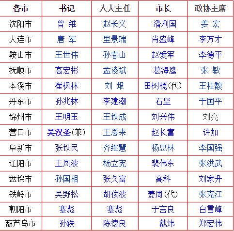 编者按:现将沈阳、大连、鞍山、抚顺、本溪等14个辽宁省地市的市委书记、人大主任、市长和政协主席名单及简历盘点如下