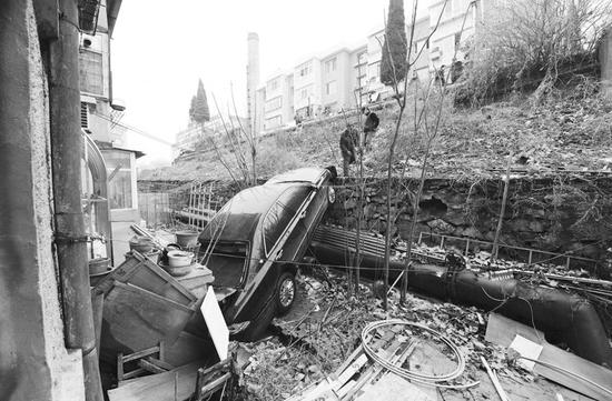 坡上为小区规划的停车位,在靠近坡沿的地方有一根比砖头还高的供暖管道,可惜没能挡住这辆车。发生碰撞处管道的保温层脱落,里面的金属管道裸露出来。