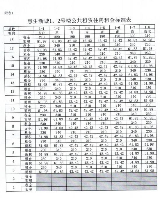 建筑面积为36.89 平方米户型的基准租金为每月每套330元;建筑面积为40。 38-40.78平方米户型的基准租金为每月每套360元。 以顶层和底层南向为基准租金,其余楼层均加20元;东、 西、东北、西北朝向每套在所属层租金标准上减10元。