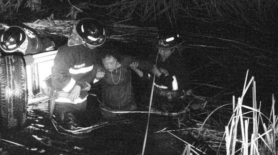 凌晨女子驾车扎进5米深沟倒扣水中