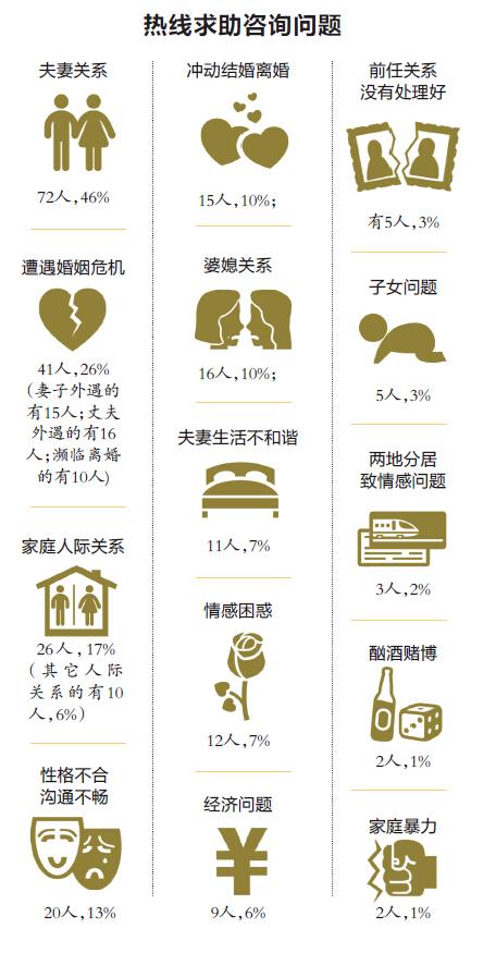 重庆官方婚姻家庭情感热线——“幸福热线”昨日发布了今年第一季度的婚姻问题分析报告。20%的求助者咨询的是婚外情问题。