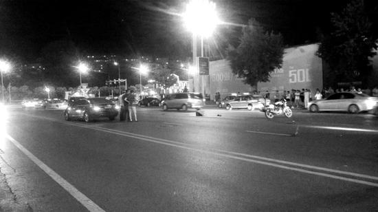 记者在现场看到,该男子倒在路中央,身上用蓝色塑料板盖着,地上有一大摊血迹。旁边的反道上停着一辆黑色奥迪轿车,车头右前角有破损,前挡风玻璃右下角被撞裂。交警正在进行现场勘查工作,事故现场吸引了数百名群众围观。