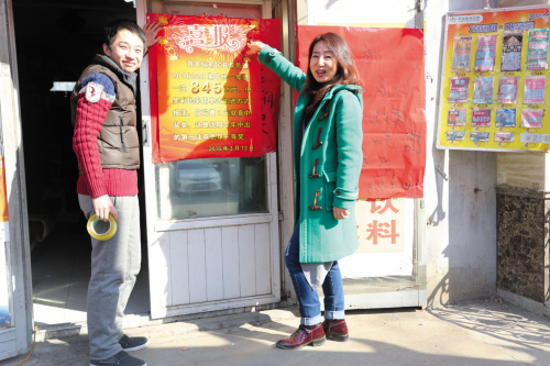 6386号投注站站主和母亲一起粘贴喜报。