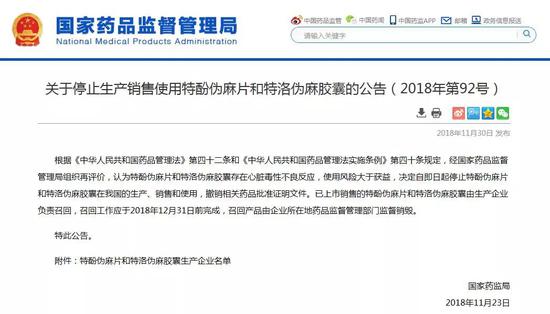 国家药监局要求,已上市销售的特酚伪麻片和特洛伪麻胶囊由生产企业负责召回,召回工作应于2018年12月31日前完成,召回产品由企业所在地药品监督管理部门监督销毁。