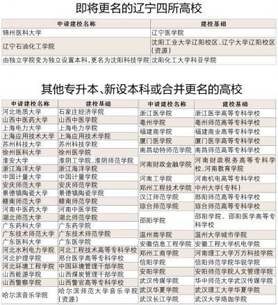 辽宁医学院拟更名为锦州医科大学、沈阳化工大学科亚学院拟更名为沈阳科技学院,沈阳工业大学辽阳校区和辽宁大学辽阳校区(资源)有望合并变更为辽宁石油化工学院。