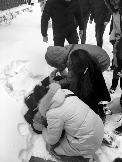 这一幕刚好被他身后的一位女子看到,她丝毫没有犹豫就冲了过去,脱掉厚重的外衣,双腿跪在雪地里,开始用力给其做胸部按压。