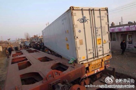 #沈阳突发#【东站四巷#汽车与火车相撞#】下午2时许,沈阳市大东区东站四巷,八家子水果市场后身,一辆装香蕉的集装箱货车停在铁轨旁被一辆倒车的火车顶出10余米。火车上的一名调度员的一条腿被撞,持续关注!