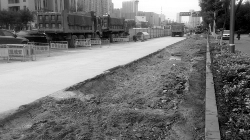 的哥张师傅一边等车一边抱怨:“这是干什么呢?怎么大卡车、挖掘机就这么横在马路上,施工现场也没有围挡,运沙土的卡车当街卸土,搞得乌烟瘴气,真是伤不起。”