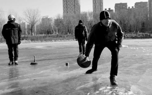 原来他们在进行着一项游戏,乍一看好像是冰壶,但又似乎与我们在电视上看到的冰壶比赛并不相同。同样是冰壶的底座,滑在冰面上往前跑,但是上面却直直插着一个木头柄,远远看起来像是很多跳棋的棋子。