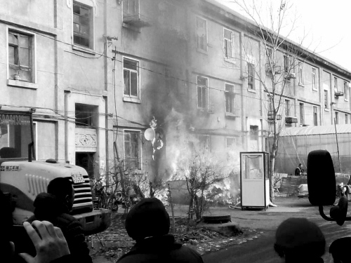 2月14日11时许,大东区东陵西路新东三街四号楼四单元楼下突然着起火,火苗蹿至3层楼高。当沈阳晚报、沈阳网的记者来到现场时,火势已经被控制住,可以看到一个10平方米左右的彩钢房已经被烧成废墟,里面有过火的锅碗瓢盆,烤糊的猪蹄儿、蔬菜和一些烧毁的杂物。紧挨着的居民楼外墙也是一片漆黑。