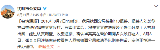 8月11日,沈阳市公安局的官方微博对此事发布警情通报:8月8日,崔某某因涉嫌虐待被看护人罪被铁西分局依法予以刑事拘留,案件正在进一步办理中。