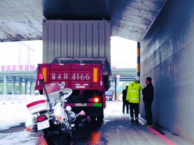 9月3日6时许,大东区柳条湖公铁桥处,一辆大货车卡在桥下动弹不得,旁边的货车司机一脸委屈,嘴里还不时念叨着,“我明明是先过了限高杆才往前开的啊。”