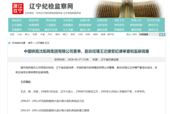 据中国铁路总公司党组纪检组、辽宁省监委消息:中国铁路沈阳局集团有限公司董事、副总经理王迁涉嫌严重违纪违法,目前正接受纪律审查和监察调查。