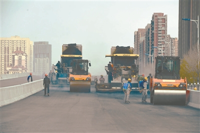 金阳大街摊铺路面层沥青 成为沈阳首条防冰融雪的快速路