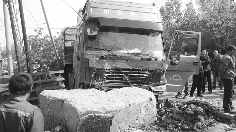 “幸好路边有一块大石头,就差两米的距离,这辆失控的大货车就冲进民房里面去了。 ”昨日8时许,有市民给本报热线打来电话反映,在甘井子区革镇堡火车站附近,一辆大货车因为溜车,顶飞了一辆停在路边的小货车,之后又冲向路边的民房,在撞倒一棵大树和路灯杆后,又顶飞了一块大石块才停了下来。而被大货车顶飞的大石块,正好砸在一辆轿车的前机关盖上。