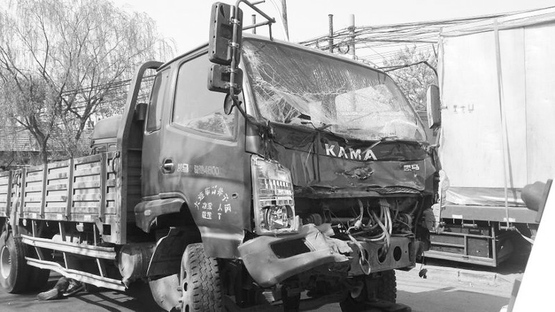 在后革街东侧,一辆小货车停在路边,小货车的前脸被撞得凹了进去,前保险杠已经完全被撞碎,前挡风玻璃也全部粉碎。在地面上留有数十米的刹车痕迹,可见小货车被顶飞了十多米远。而在后革街的道西侧,一辆轿车的前机关盖上压着一块足有五六百斤的大石块,轿车的前机关盖被砸了一个大瘪,前保险杠和前大灯等全都被砸碎。在轿车的北侧,一辆大型货车车头顶在大石块上,前脸几乎被撞毁,大货车的西侧,一棵大树被撞倒,整棵树被连根拔起。在树的旁边,一根路灯杆也被撞得倾斜了。记者观察到,大货车的车头距离路边民房仅剩下不到两米的距离。“幸好是晚上发生的,被牵连的两台车上都没有人,如果有人的话,后果不堪设想。 ”围观市民如是说。