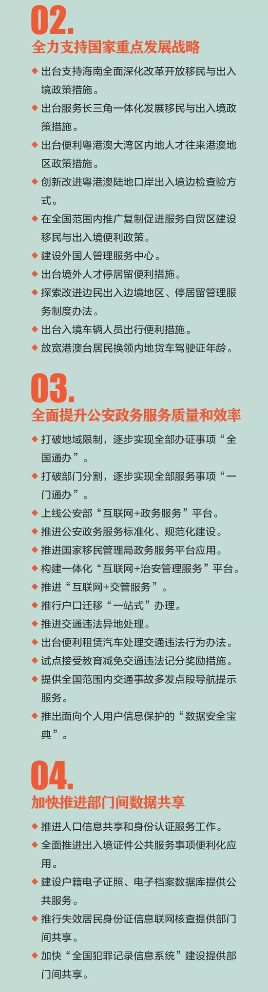 三是全面提升公安政务服务质量和效率方面,包括:逐步实现公安政务服务事项“全国通办”、“一门通办”、“一网通办”、“一次性办”,推行户口迁移“一站式”办理,推进交通违法异地处理,试点接受教育减免交通违法记分奖励措施等13项措施。