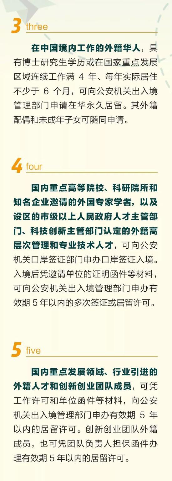 二是放宽签发长期签证和居留许可的对象范围。优化营商环境,为来华经商、工作、研学的外国人签发长期有效的签证和居留许可。对国内重点高等院校、科研院所、知名企业邀请来华从事技术合作、经贸活动以及在华工作的外籍人才,对外籍高层次人才工作团队及辅助人员,签发2-5年有效的签证或居留许可。