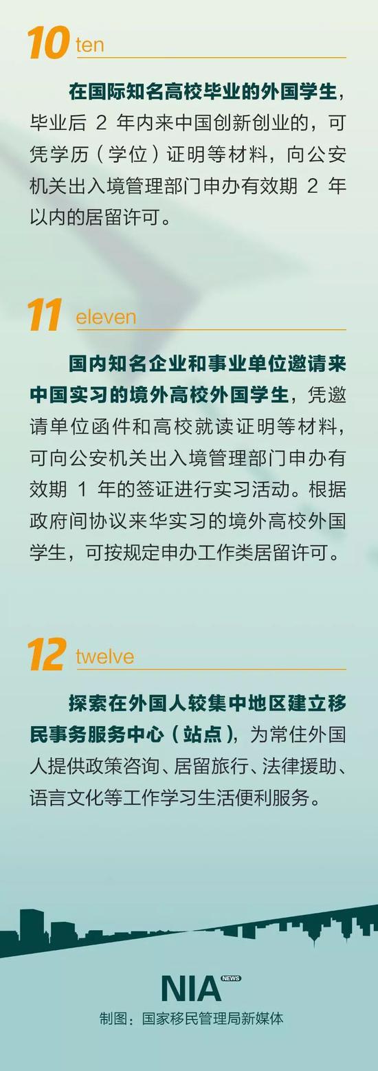 三是拓宽外国人才引进对象范围。为外国优秀青年在华创业创新提供服务,对在国内重点高等院校、国际知名高校毕业的外国优秀学生在华创新创业、国内知名企事业单位邀请来华实习的外国学生,提供办理签证和居留许可政策支持和便利服务。