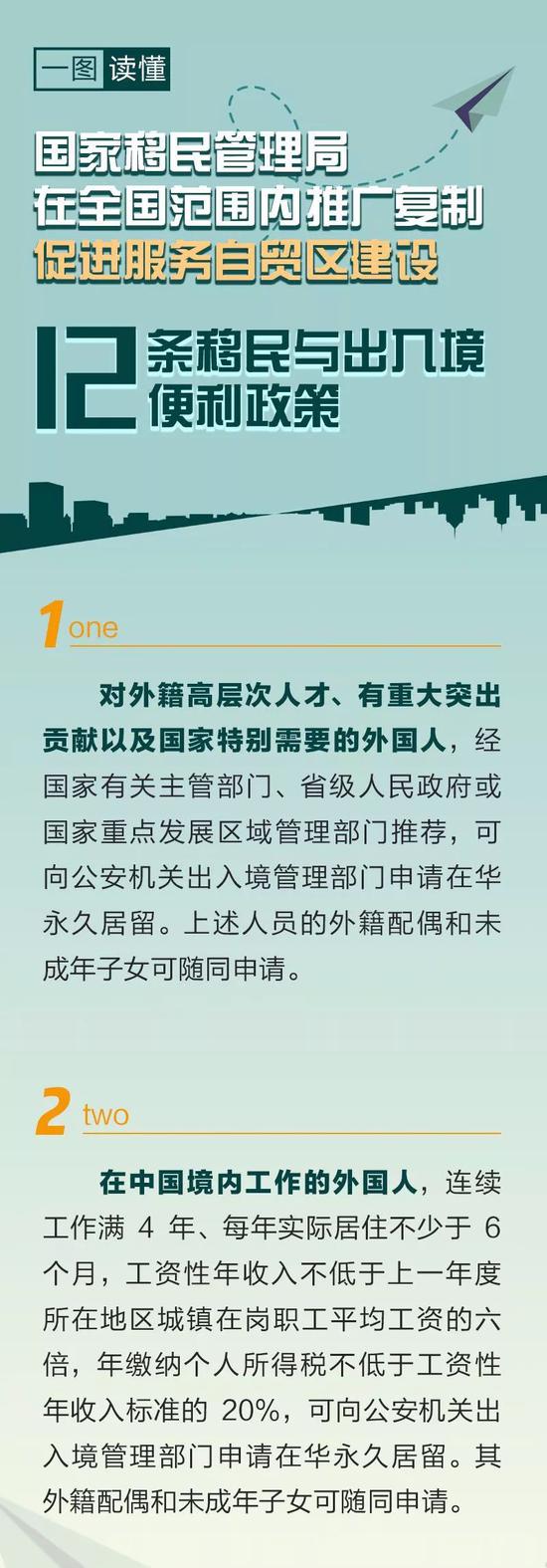 发布会还通报了在全国范围内推广复制促进服务自由贸易试验区建设12条移民与出入境便利政策具体情况,这批移民与出入境便利政策,是60项措施中首批公布实施的一项。