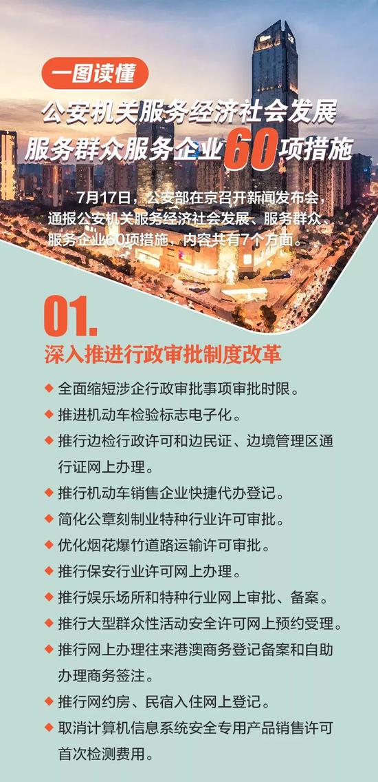 记者从发布会了解到,7个方面60项措施,涵盖了公安机关面向社会、面向企业、面向群众的大多数服务管理事项,受益面广、含金量高。这一大批创新举措公布实施后,将进一步对接发展需要,激发市场主体活力,提升群众、企业获得感;有力推动公安服务管理工作信息化、便利化,提升公安工作现代化水平。