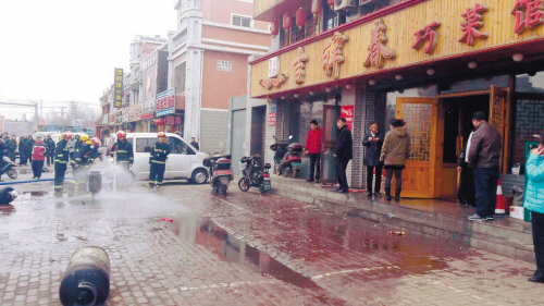 2月28日13时许,沈阳晚报、沈阳网记者赶到于洪区东平湖街2号楼,在人群中找到了名为“吉祥春巧菜馆”的起火饭店。消防官兵正在对一个煤气罐进行二次降温。围观者说,正是这个煤气罐着的火,“中午时,换罐的工人进行更换时,刚把管道接到这个新煤气罐时,就遇到厨师炒菜的明火了,火一下子就着了起来。”