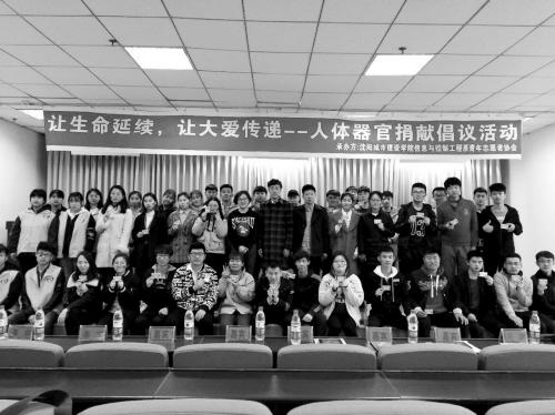 4月3日14时多,午后的沈城被倒春寒笼罩,但是并未阻挡住沈阳城市建筑学院报告厅里举行的志愿者集体登记人体器官捐献活动。49名大学生志愿者如约而至,从校园各个角落赶来,一起签下人体器官(遗体、组织)捐献志愿书,交到辽宁省红十字器官捐献志愿服务队队长杨东文手中。据悉,这是迄今为止全市启动人体器官(遗体、组织)捐献工作以来,集体登记人数最多的一次。沈阳晚报、沈报融媒记者进行了采访。